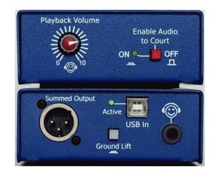 USB DI-Q är ett USB-analog-interface, som används för att hantera uppspelningen av ljudfiler. Med bara en knapptryckning skickar du ljudet till domstolens PA-/ljudsystem så att det hörs i lokalen när så önskas.