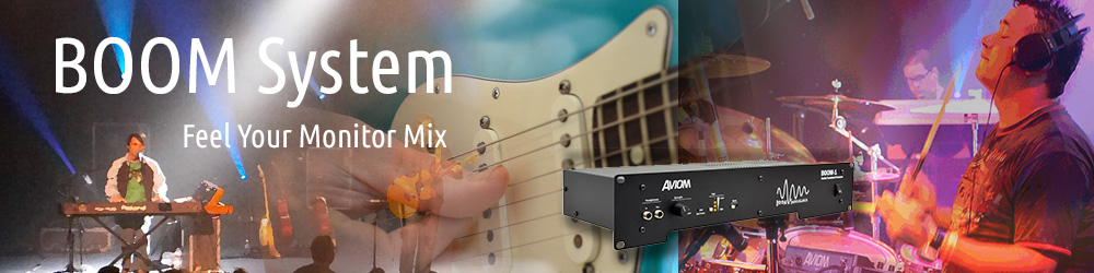 BOOM-systemet från Aviom låter dig som är trummis, keyboardspelare, sångare eller artist ”känna” de lågfrekventa bastonerna i trumstolen, keyboardstativet eller golvet, som vibrerar i synk med de lågfrekventa tonerna i din monitormix.